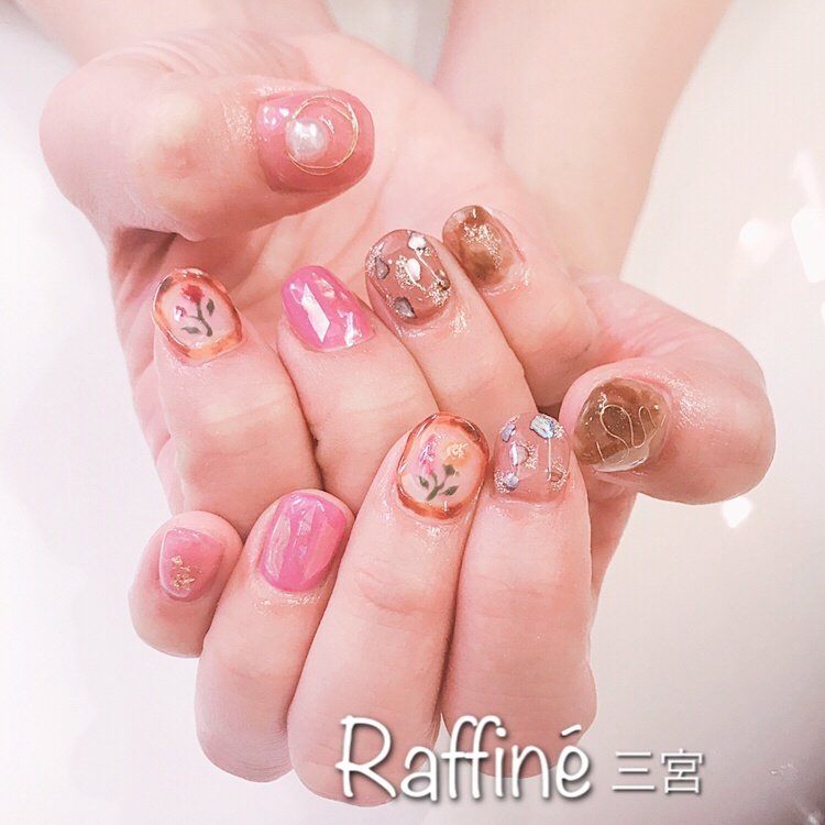 囲みべっ甲 花柄ネイルにネイルアレンジ Cinontio Nail X